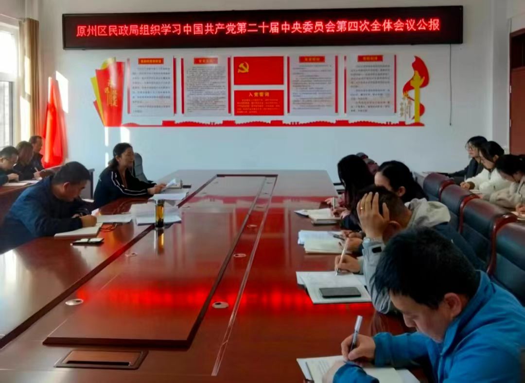 原州区民政局召开专题会议,传达学习党的二十届四中全会精神,要求民政系统全体干部职工要提高政治站位,切实把思想和行动统一到党中央决策部署上来,将全会精神纳入“十五五”民政发展规划,科学设定发展目标,不断提升民生服务质效,全力抓好各项重点工作,推动全区民政事业高质量发展取得新成效、再上新台阶。