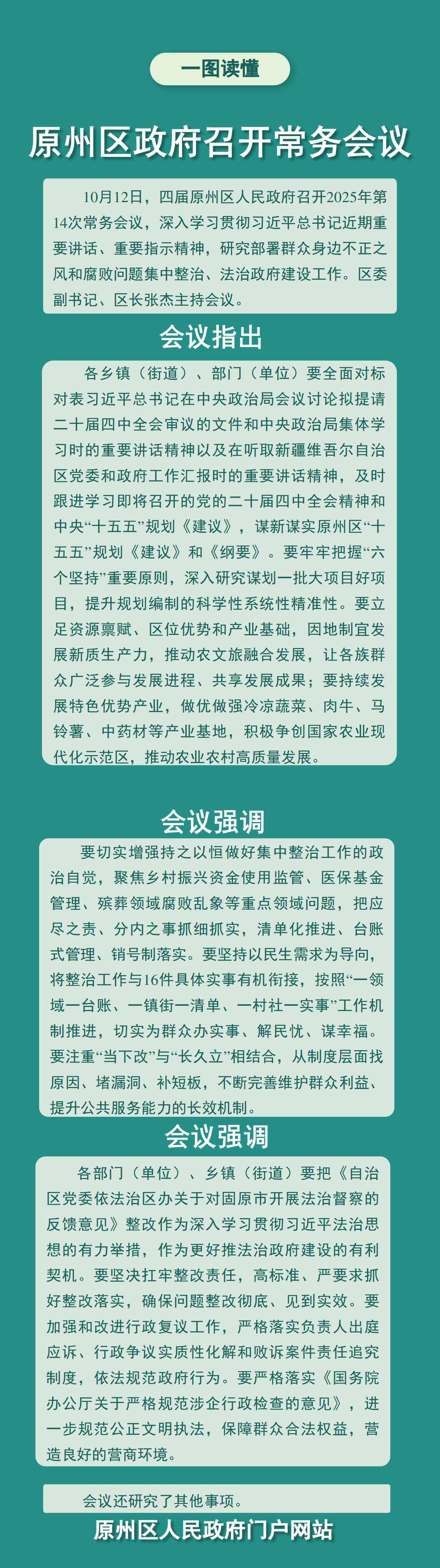 10月12日,四届原州区人民政府召开2025年第14次常务会议,深入学习贯彻习近平总书记近期重要讲话、重要指示精神,研究部署群众身边不正之风和腐败问题集中整治、法治政府建设工作。区委副书记、区长张杰主持会议。