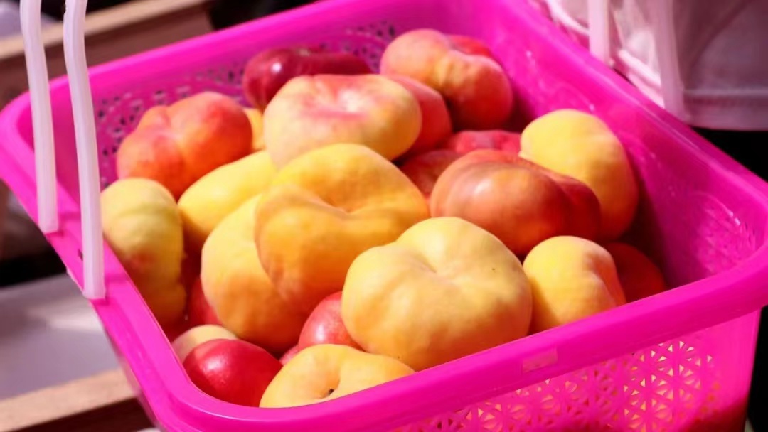 蟠桃园内果农正忙着去袋、采摘、筛选、装箱。“这刚摘下来的桃子不仅好看,而且清甜多汁,非常好吃,欢迎大家前来采摘。”王金强是这片果棚的主人,见到他时,他正在利用短视频平台进行直播带货,向广大网友讲解自己家的蟠桃。
