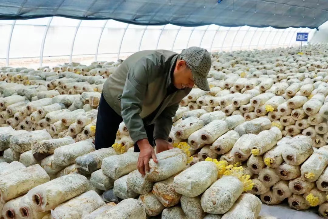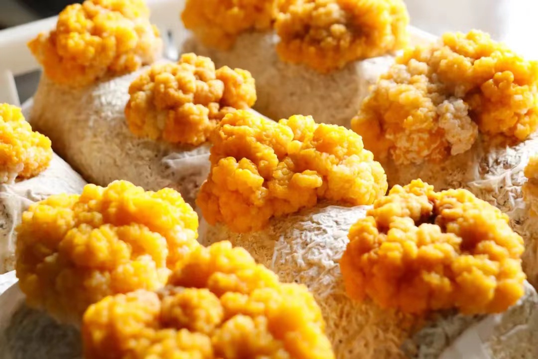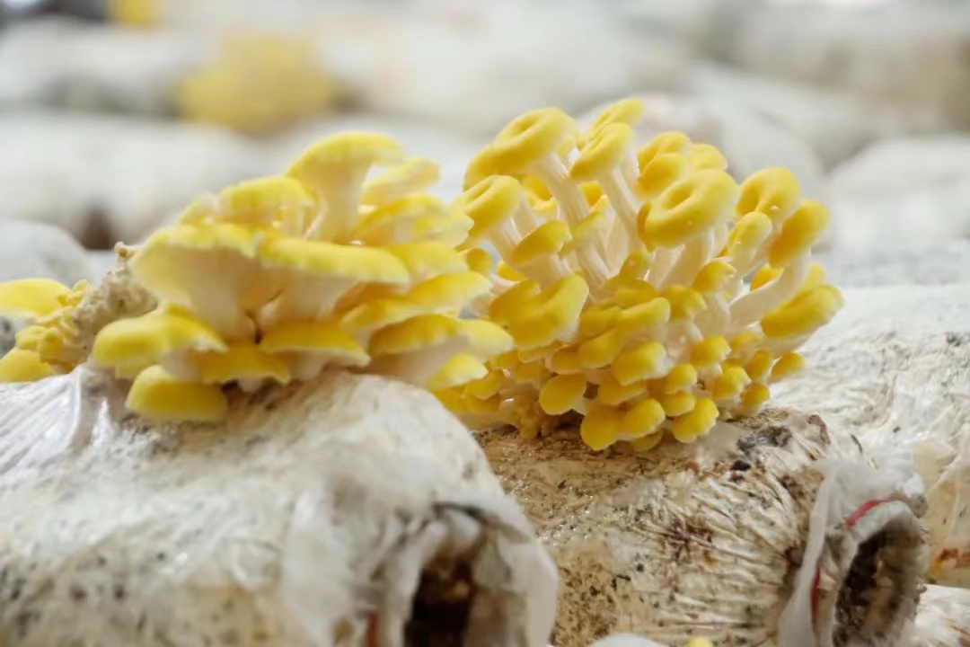 “榆黄菇最适宜的生长温度为23°到27°,湿度要保证在80%—90%之间,每天浇水2—3次。若水分过多,容易造成死菇;若光线不足,菇体颜色浅黄至浅白,不利于鲜嫩、金黄色泽的优良商品菇形成。”在魏先传的悉心指导下,一朵朵金黄的榆黄菇簇拥而生,色泽饱满、大小不一、错落有致,格外惹人喜爱。