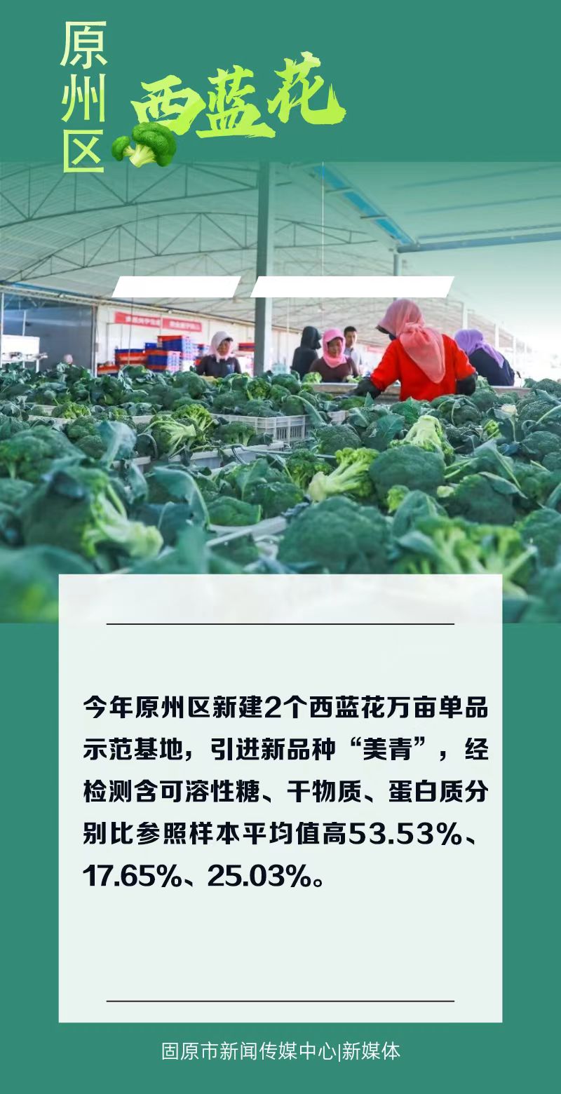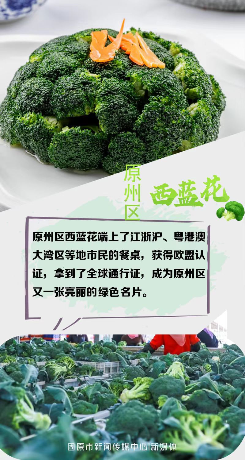 每年7月是原州区西蓝花丰收的时节,连片的西蓝花宛如绿色的海洋。背着箩筐的菜农穿梭在西蓝花田里,手起刀落快速高效地收割着成熟的西蓝花。装筐后的西蓝花运往附近的联农带农西蓝花收购点,经分拣、装箱、加冰、封装后,端上了江浙沪、粤港澳大湾区等地市民的餐桌,还获得了欧盟认证,拿到了全球通行证,成为原州区又一张亮丽的绿色名片。