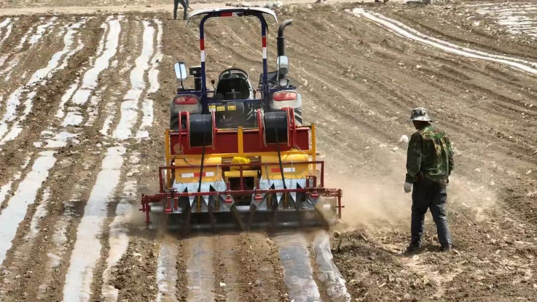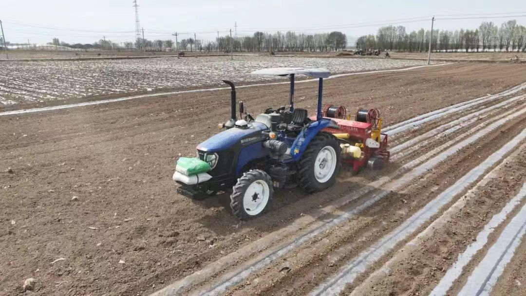 近日,记者在现场看到,在技术人员设定参数后,搭载北斗导航系统的播种机自动规划路线,灵活地转弯、掉头,所到之处,土地被整齐地翻耕,地膜被平整铺展。机身配备的智能传感器实时监测土壤湿度、种子间距等关键数据。