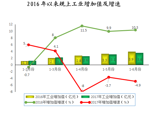 1-6月份,全区规模以上工业企业累计完成工业增加值3.6亿元,同比下降4.9%,增速同比回落15.2个百分点,环比回落1.2个百分点,比全市平均水平低16.4个百分点,比自治区平均水平低14.9个百分点。