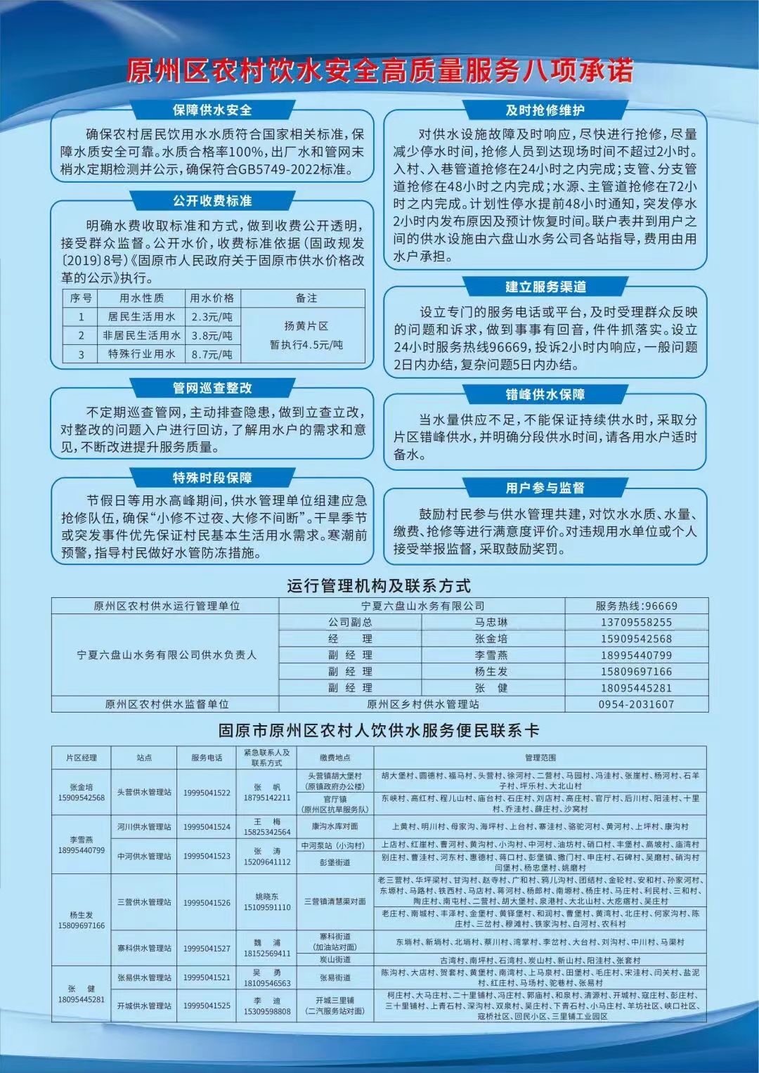 为进一步提升农村饮水安全保障水平、优化供水服务质量,切实解决大家在用水过程中的后顾之忧,特推出《原州区农村饮水安全高质量服务八项承诺》及《固原市原州区农村人饮供水服务便民联系卡》,现随信推送。若您在用水过程中遇到任何问题,可随时依据相关信息联系咨询。
