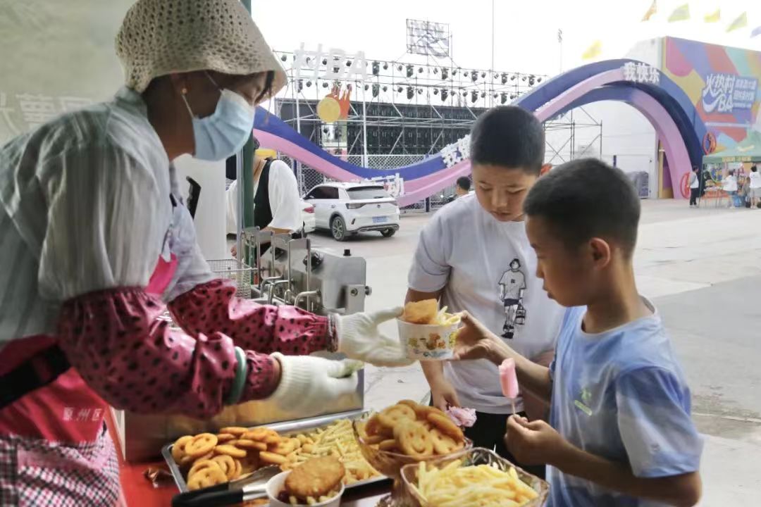 为满足观众的饮食和购物需求,赛事方在场外精心设置了醇香市集,原州特色农特产品、非遗文创产品与地道村宴美食吸引广大市民驻足其间。滑嫩的凉粉鱼鱼、喷香的妈妈油香、鲜香的牛羊肉、酥脆的薯饼薯条,各种特色美食的香味弥漫在空气中。思含掇绣、河川红梅杏、杨郎香瓜、原州黄牛肉等琳琅满目的产品也吸引了众人的目光,大家在观赛之余,纷纷驻足挑选,为家乡“带货”。 “真没想到这次村BA 能有这么多人来,天天都不够卖,这几天的收入比我预期的多太多了。”海宪忠是河川乡的一名监测户,得知村BA的举办需要有美食商户后,他果断报名,带着他的拿手作品——手抓饭,来到了比赛现场。“运动员消耗量大,抓饭营养丰富,他们一品尝觉得好吃,就给我宣传开了。”从开幕式起,海宪忠的手抓饭就卖出了名声,深受大家喜爱。